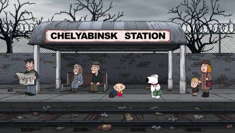 В 21-м сезоне мультсериала вышла серия, посвященная России и, в частности, Челябинску. По сюжету герои приезжают в Челябинск, который авторы иронично называют «Уральским Чикаго», чтобы найти хакера, укравшего аккаунт Брайана в социальной сети. В ходе этой авантюры Мэг влюбляется в русского хакера Ивана и остаётся жить в России, что добавляет что добавляет истории присущей для сериала абсурдности.