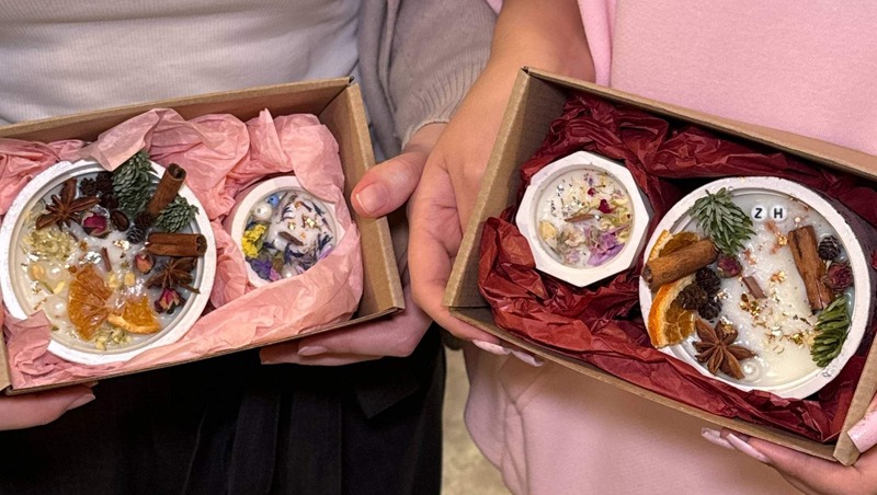 Мастер-класс по созданию ароматических свечей в гипсе предлагает полное погружение в процесс: участники выбирают и декорируют гипсовое кашпо поталью, создают индивидуальную парфюмерную композицию и заливают свечу с древесным фитилем. В 15-минутный кофе-брейк гости наслаждаются чаем и конфетами, после чего украшают готовое изделие сухоцветами. Пока основная свеча застывает, каждый создаёт ещё одну мини-свечу — подарок от мастерской. Итог — две уникальные свечи, упакованные в крафт-коробки с лентой и бумагой тишью.